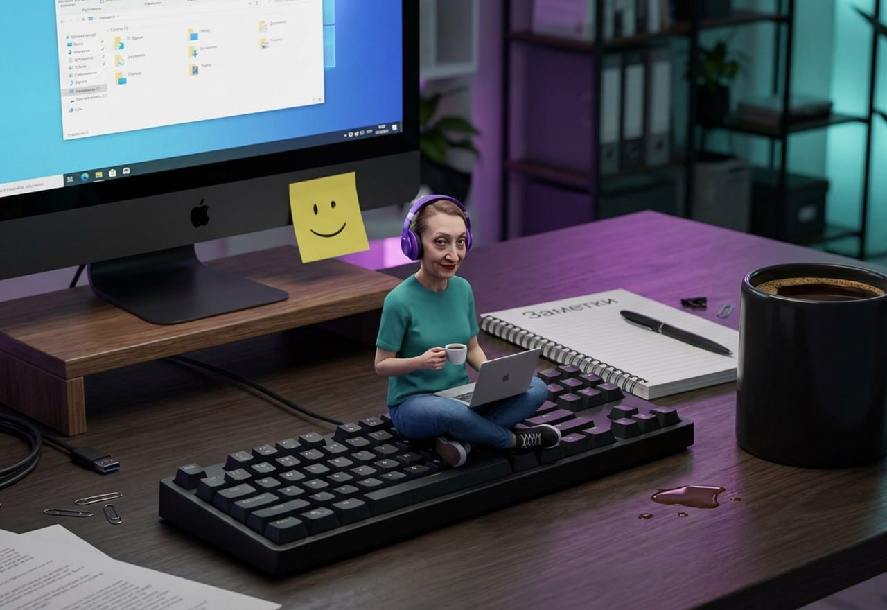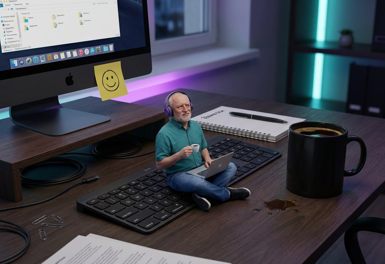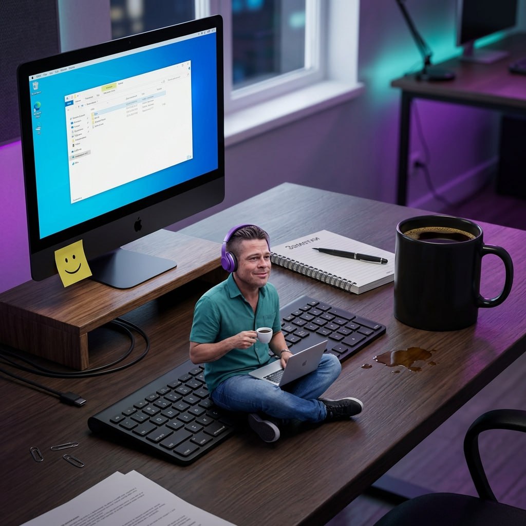 Гиперреалистичный 8-каратный широкоугольный снимок современного домашнего офиса в стиле минимализма, выполненный в черном цвете и из натурального дерева. Крошечный человечек в масштабе 1:10, чье загруженное лицо сохранено в точности как на контрольном изображении, сидит, скрестив ноги, за матово-черной клавиатурой, в фиолетовых наушниках, бирюзовой рубашке с короткими рукавами, синих джинсах и черных кроссовках, держит в руках миниатюрный серебристый ноутбук и крошечную белую кофейную чашку с легкая ухмылка. За клавиатурой находится блокнот на спирали с надписью “Заметки” и черная ручка. Слева на черном мониторе с тонкой рамкой, установленном на деревянной подставке, виден светлый проводник файлов и желтая наклейка со смайликом. Справа — большая черная кружка, наполненная темным кофе. На столе из темного дерева немного пролит кофе, несколько бумаг, скрепок и чистых черных кабелей, мягкое естественное освещение и слегка размытый фон современного офиса. Сейчас ночь, и на заднем плане горят фиолетовые и бирюзовые лампочки. Компьютер должен быть iMac.
