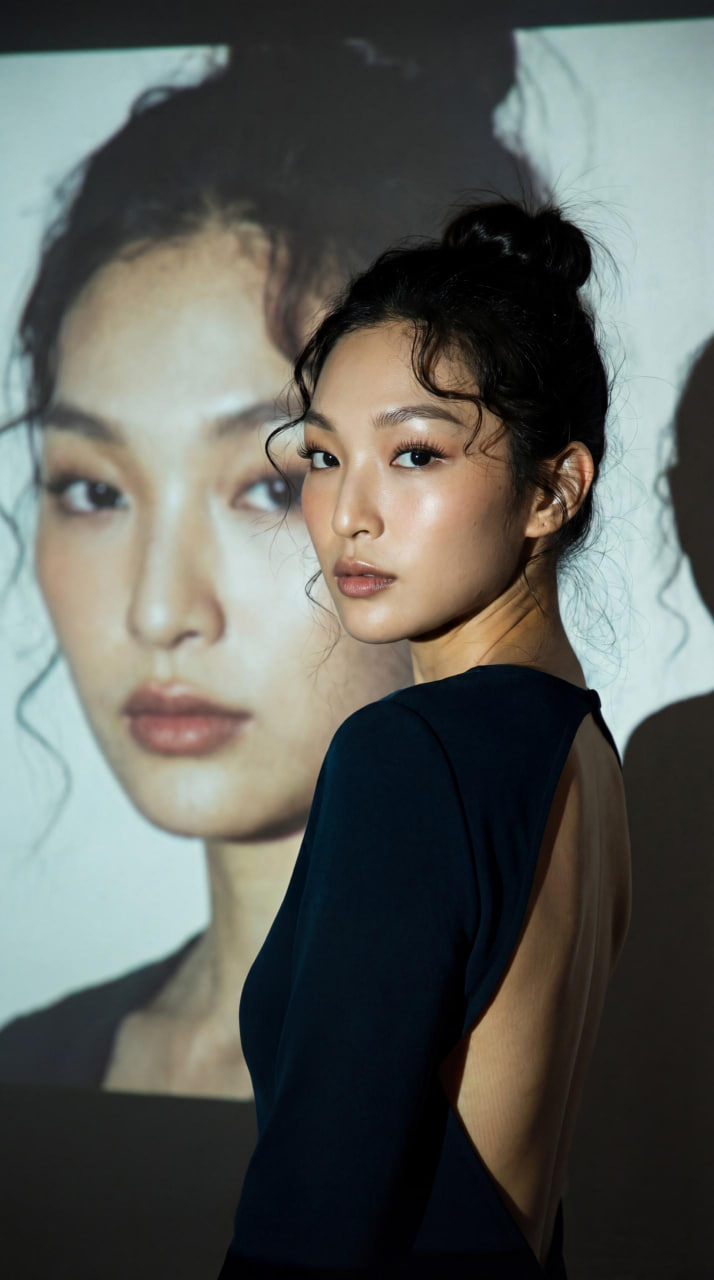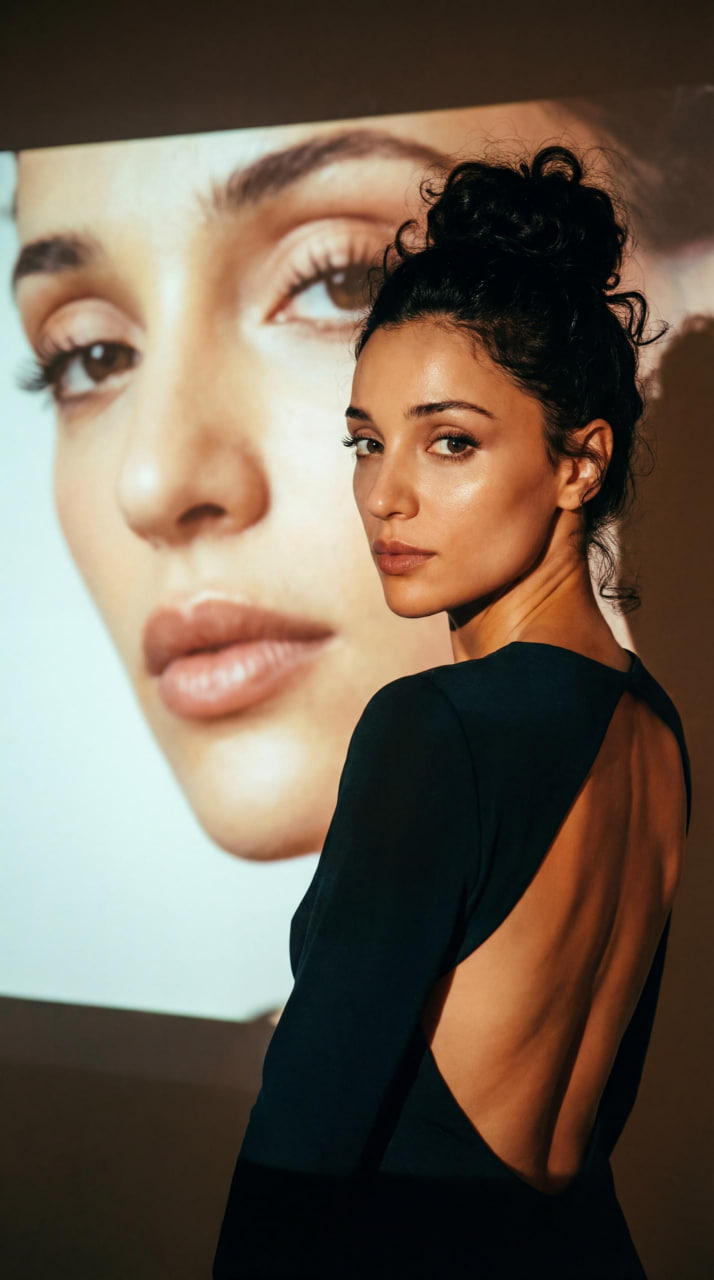 Создай фото, не меняя лицо. На фотореалистичном портрете женщина со спины, повернувшаяся, чтобы посмотреть через плечо. На ней черное платье с открытой спиной и треугольным вырезом. Ее темные волосы собраны в беспорядочный вьющийся высокий пучок, обнажающий спину и плечи. Лицо женщины идентично оригинальному изображению: теплый оттенок кожи, мягкий макияж, длинные ресницы и полные губы, создающие прямой зрительный контакт с камерой.