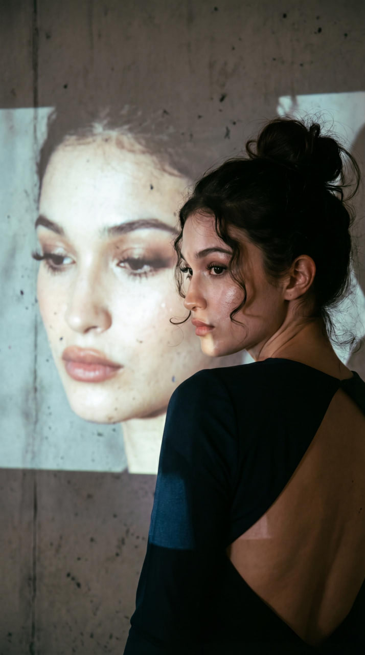 На заднем плане — большой, от стены до стены, экран проектора, на котором крупным планом, не в фокусе, изображено лицо женщины под немного другим углом, и на сцену проецируется собственный теплый свет. Кинематографическое освещение, теплое и атмосферное. Съемка на пленке, крупное натуральное зерно, небольшая глубина резкости, четкий фокус на реальной женщине, фон в стиле боке. Проецируемое изображение получается ярким и красочным. Высокодетализированная текстура кожи, необработанная фотография, реалистичное взаимодействие света между проектором и реальным человеком.