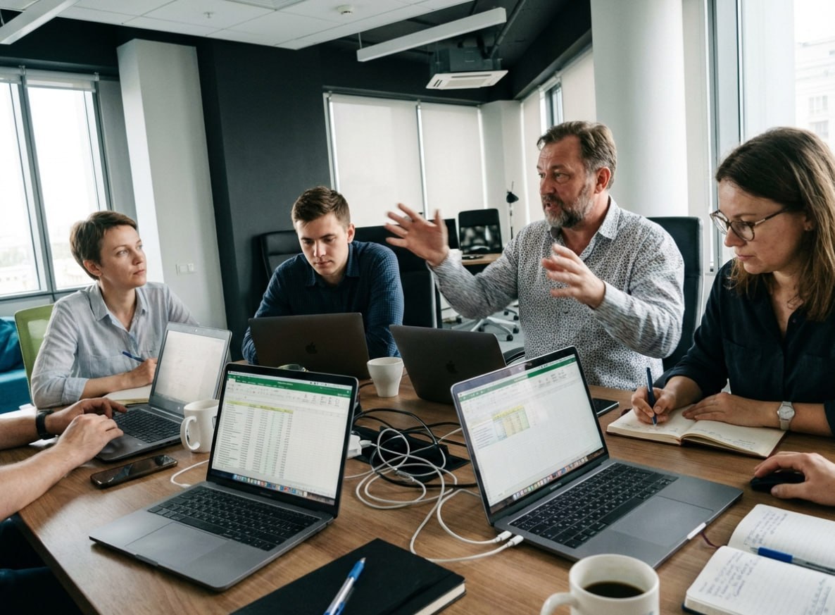 Камера расположена сбоку, как будто фотограф стоит в стороне от стола. Люди частично перекрывают друг друга, не все в резкости. На столе ноутбуки, блокноты, ручки, кружки, провода, открыт рабочий документ или таблица. Есть небольшой беспорядок — сдвинутые предметы, открытые записи.
