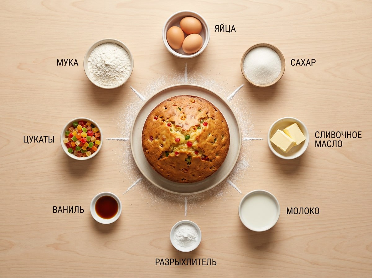 Композиция строго сверху (top-down), центральный объект — готовый кекс с цукатами на светлой тарелке или чистой нейтральной подложке, домашняя выпечка с золотистой корочкой и видимыми цукатами внутри. Вокруг кекса по идеально ровному кругу симметрично и равномерно разложены ингредиенты рецепта в отдельных небольших емкостях или аккуратно выделенных зонах: мука, яйца, сахар, сливочное масло, молоко, разрыхлитель теста, ваниль, цукаты. От центрального кекса к каждому ингредиенту идут тонкие аккуратные линии, выполненные из муки или сахарной пудры либо минималистичной графической разметкой, соединяющие продукт с компонентами. Каждый ингредиент имеет подпись на русском языке четким аккуратным читаемым шрифтом: МУКА, ЯЙЦА, САХАР, СЛИВОЧНОЕ МАСЛО, МОЛОКО, РАЗРЫХЛИТЕЛЬ, ВАНИЛЬ, ЦУКАТЫ. Поверхность светлая, натуральная, например светлое дерево или чистый светлый стол без лишних предметов, с естественной текстурой. Освещение мягкое естественное сверху, теплое и уютное, с легкими мягкими тенями. Стиль чистой кулинарной инфографики, минимализм, строгая симметрия, визуальный порядок, высокая детализация, фотореализм, съемка строго сверху без перспективных искажений, высокая четкость.